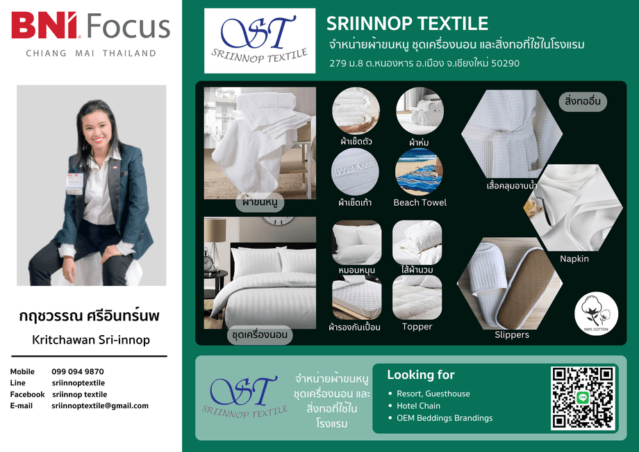 SRIINNOP TEXTILE ก่อตั้งขึ้นจากความมุ่งมั่นในการสร้างสรรค์ผลิตภัณฑ์สิ่งทอที่ตอบโจทย์การใช้งานในธุรกิจโรงแรมและที่พักอาศัย ด้วยประสบการณ์และความเชี่ยวชาญในอุตสาหกรรมสิ่งทอมานานกว่า 10 ปี